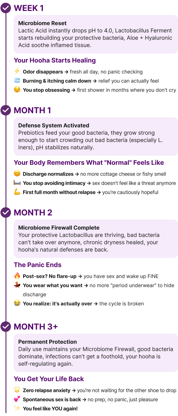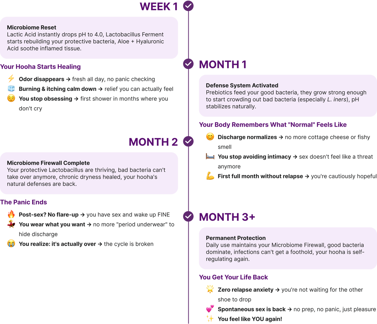 The longer you use it, the stronger your protection gets. Women who commit to 90+ days report ZERO relapses. Your microbiome becomes resilient enough to handle life again.