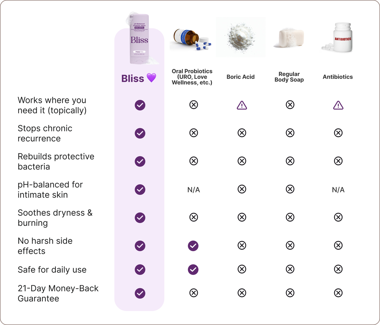 Bliss targets the root cause of chronic recurrence: destroyed protective bacteria.